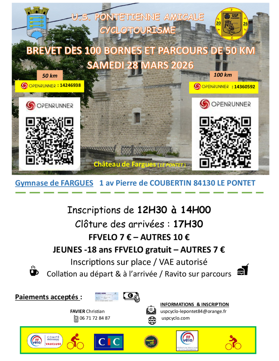 L'US Pontétienne Amicale Cyclotourisme vous donne rendez-vous pour son Brevet des 100 Bornes le samedi 28 mars 2026 à partir de 12h30 à l'adresse suivante:
